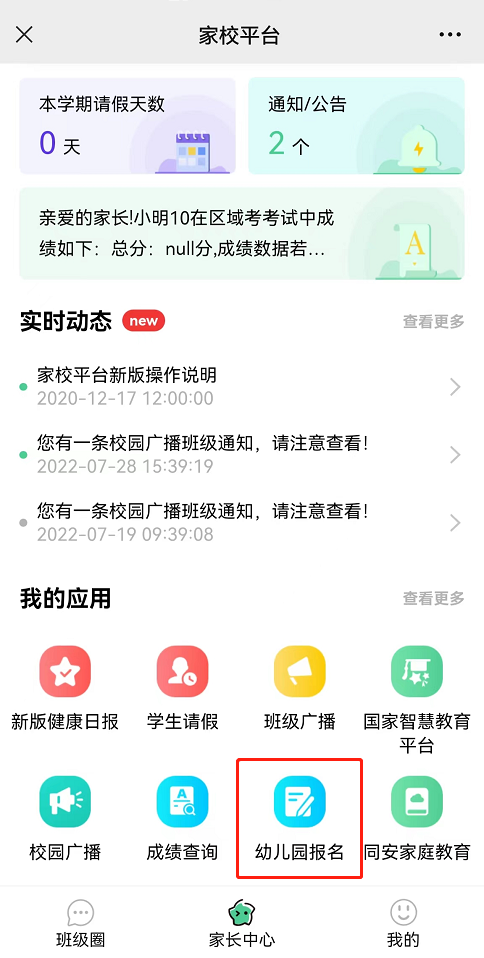 点击菜单栏中间的“家长中心”,点击“幼儿园报名”。或点击左下角菜单栏中间的“综合”,点击“幼儿园报名”。