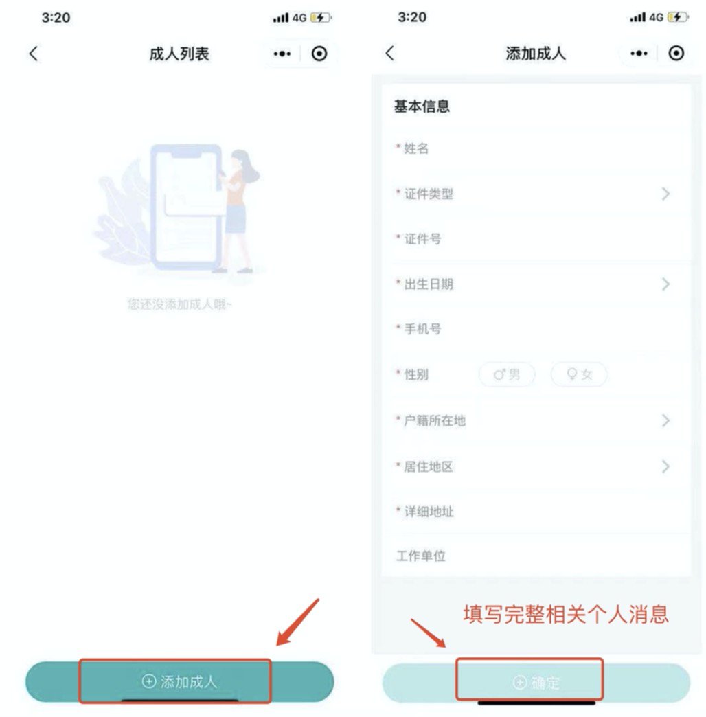 第四步:点击【新冠疫苗个人接种预约】,进入页面后点击下方【添加成人】,填写准确的个人信息并提交。
