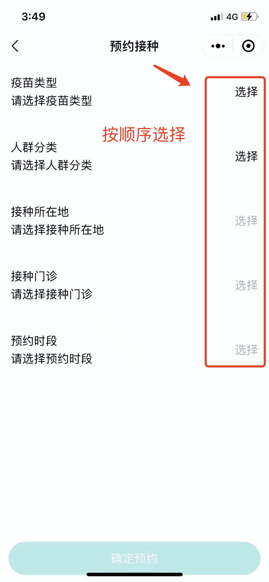 第五步:点击【预约接种】,右侧选择每一项内容,记得按顺序选择后面的选项才会出来。