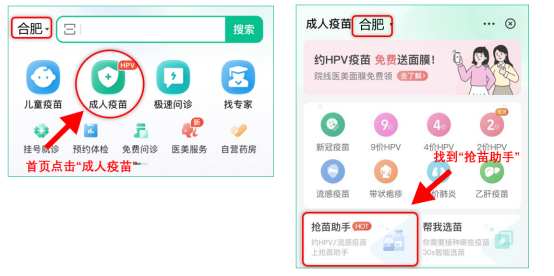 2、下载完成后,选择“合肥”地区,点击首页“成人疫苗” ,进入页面后再点击“抢苗助手”