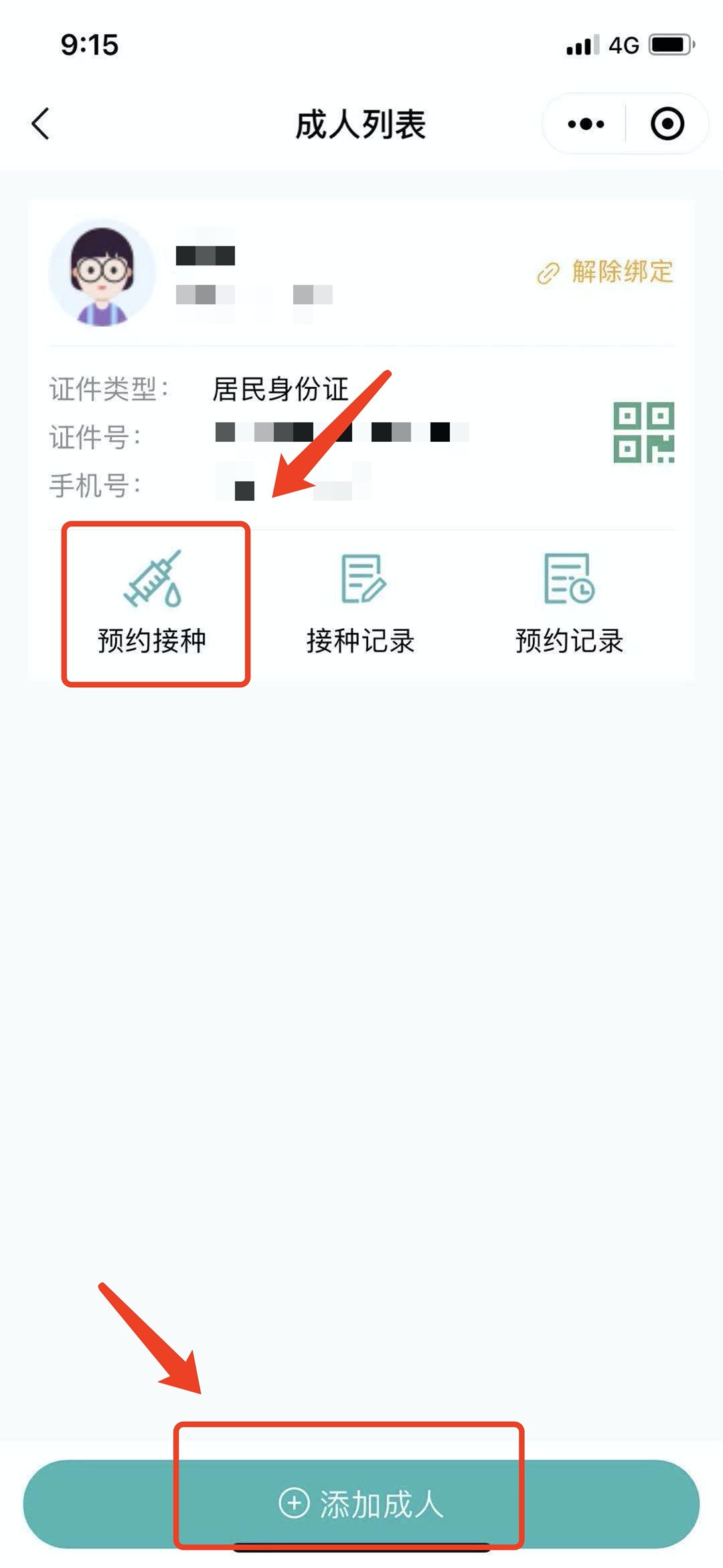 ③进入页面后查看个人信息是否正确,如果之前没有填写资料的就要先填写个人信息(如果帮家人预约,也可以点击下方“添加成人”)。