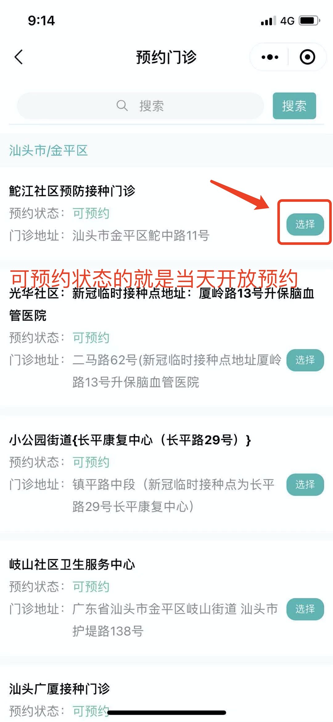 ⑤选择完区县后,可查看到当前区域内接种门诊的信息,选择显示可预约状态下的接种门诊,点击右侧“选择”,进入页面后选择时间段即可。