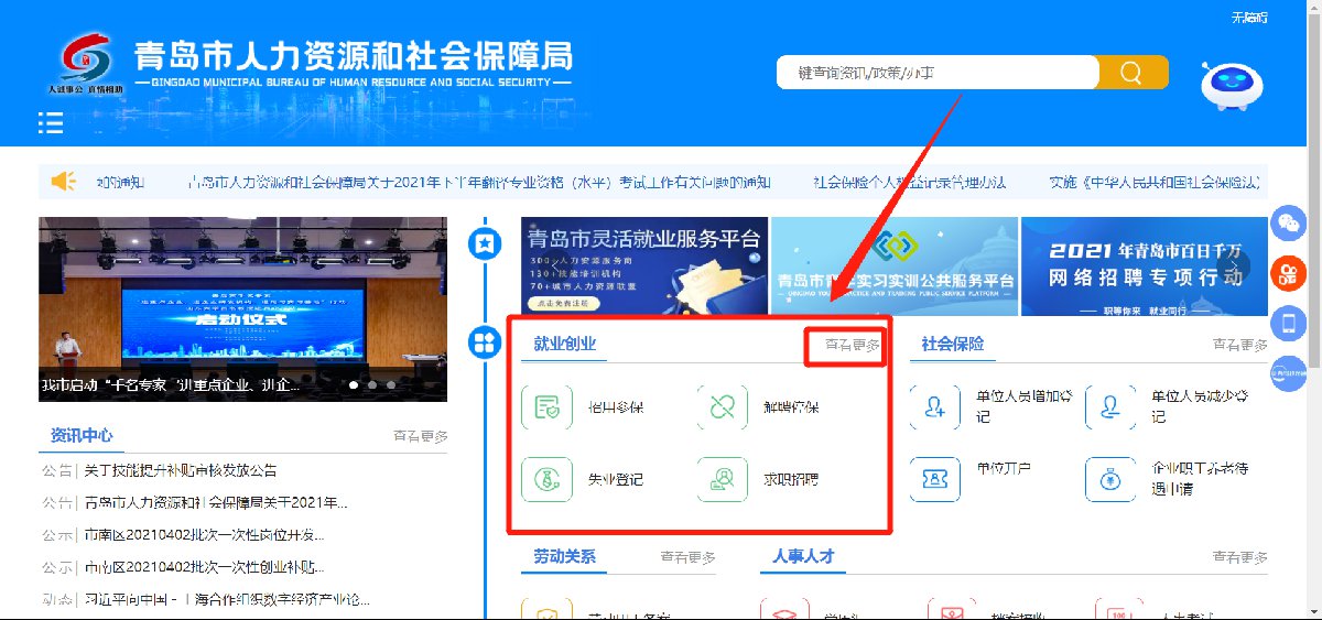 1、进入青岛市人力资源和社会保障局官网:点此进入,选择“就业创业”板块的“查看更多”。