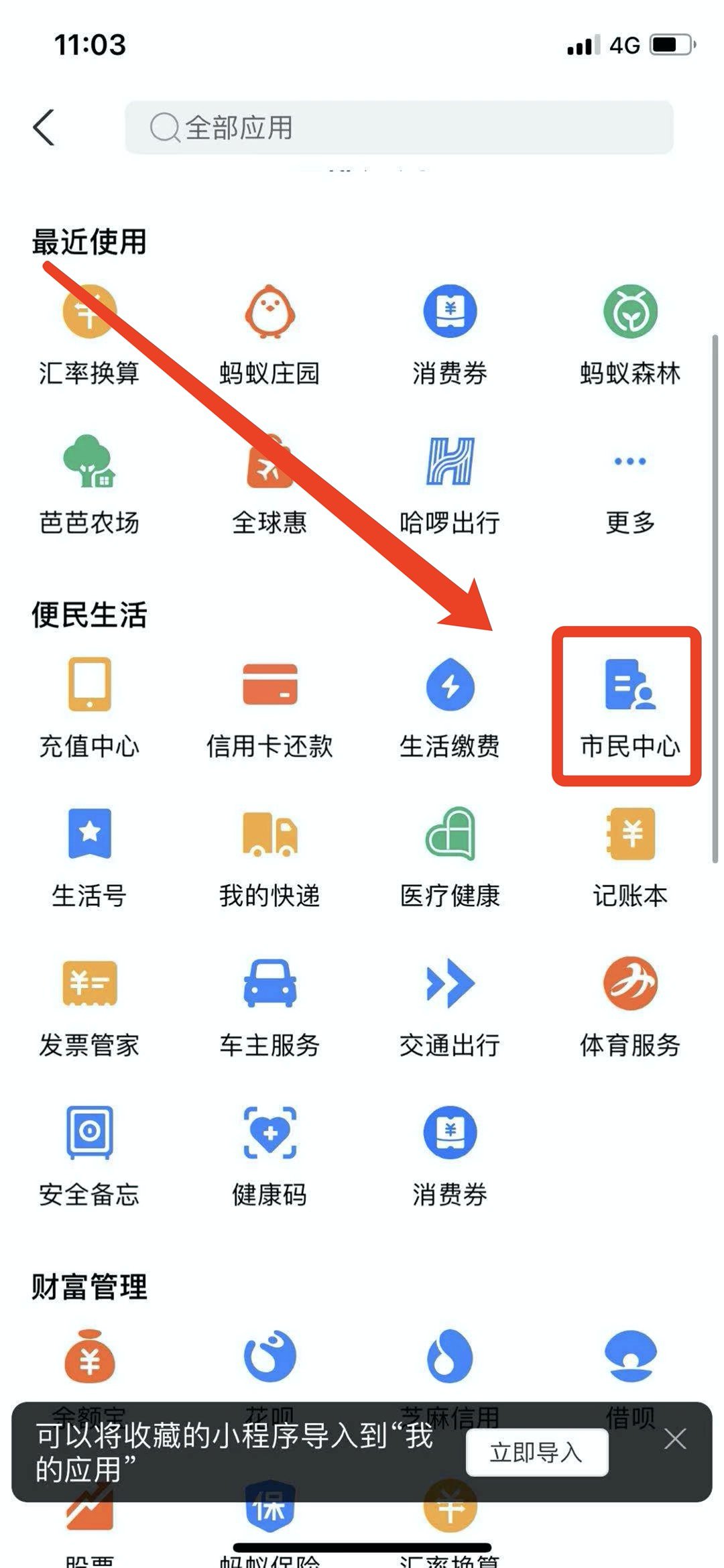 第二步:打开“支付宝”app,点击应用中的“市民中心”,选择“社保”栏目中到“社保卡补换卡”,阅读办理须知,确认办理。