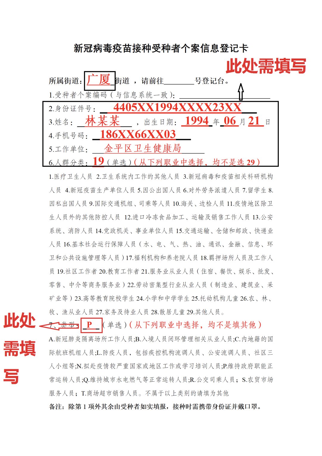 《新冠病毒疫苗接种受种者个案信息登记卡》填写方法: