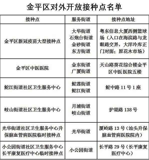 请各位居民朋友下载“粤苗”APP或通过微信小程序中“粤健通”模块进行个人预约,注册登录,选择好疫苗接种点、接种时段进行网上预约。成功预约后,携带好本人身份证原件,按预约时间准时到达预约接种点,向现场工作人员出示预约凭证入场进行疫苗接种。其中,预约在金平区人民医院、金平区妇幼保健院的群众在预约后前往金平区新冠疫苗大型接种点进行接种。