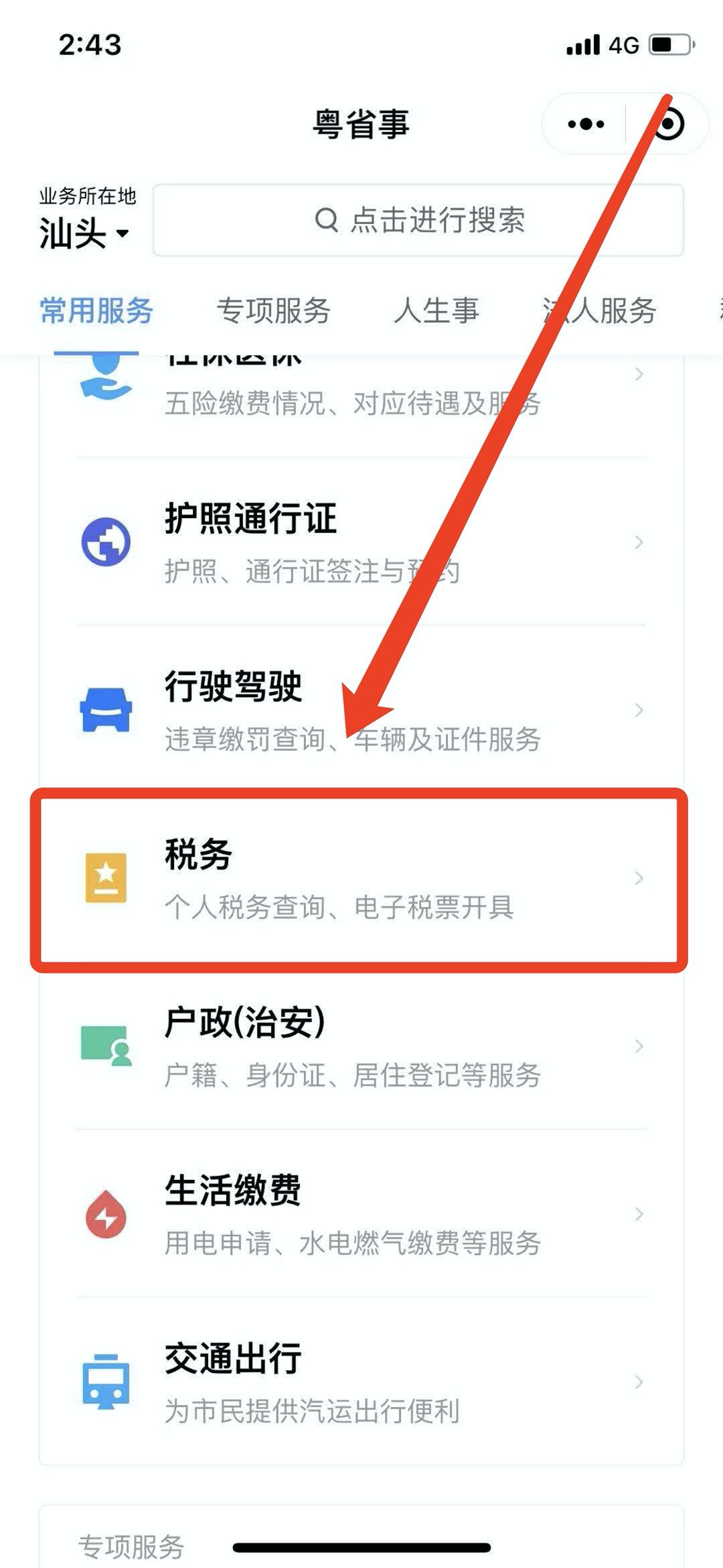 1.微信端进入“粤税通”小程序,登陆个人信息,左上角地址选汕头市。