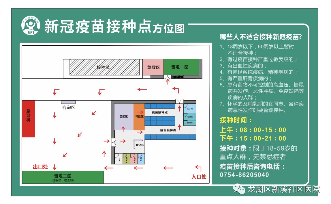 为方便广大群众接种新冠疫苗,缓解各个接种点的接种压力,减少居民排队等候时间,龙湖区政府在龙湖区医共体集团新溪医院(原新溪卫生院)建立新冠疫苗大型临时接种点。接种人员由汕头市各家医院抽调出来的医护人员组成,最多可以同时开放80个接种台,极大方便群众。