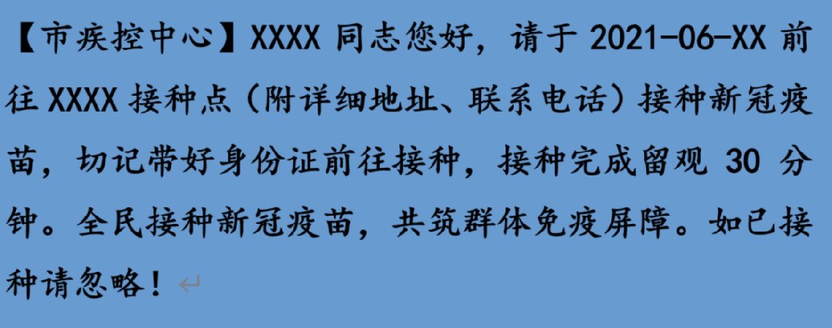 ▲市疾控中心发来的关于第二剂次接种通知(这一则为接种第二剂的正式通知,请按本短信指定的时间前往对应接种点接种)