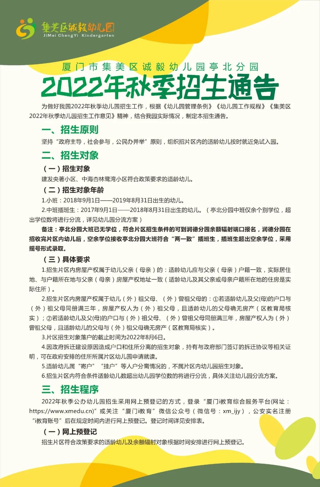 厦门市集美区诚毅幼儿园亭北分园2022年秋季招生通告