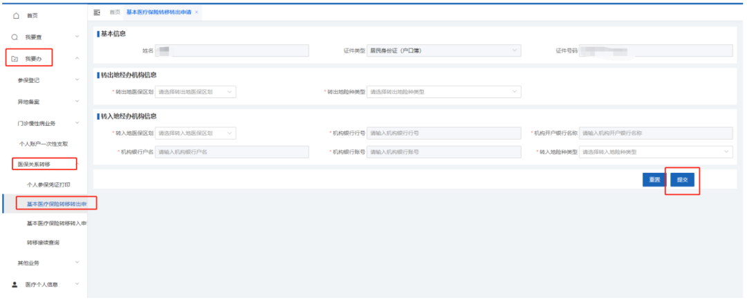 (2)选择“我要办”——“医保关系转移”下的“基本医疗保险转移转出申请 ”(需要转入地可实现线上转移经办)录入信息后提交即可推送到经办机构。