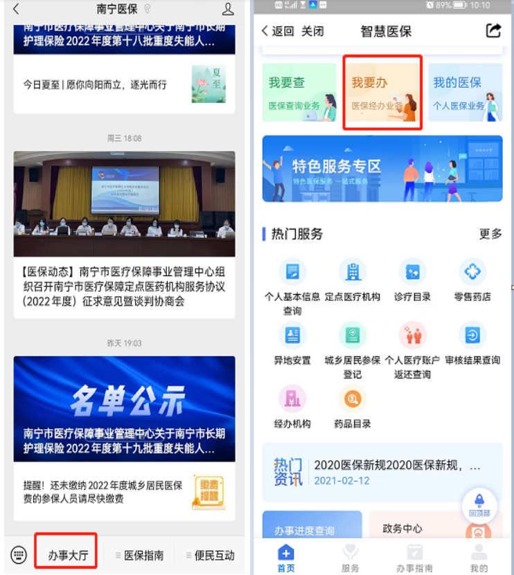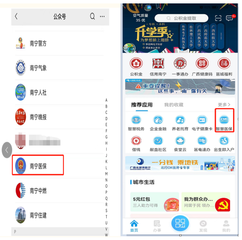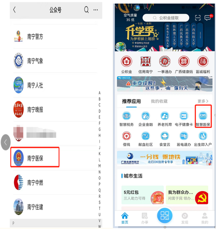 (1)点击公众号,选择“南宁医保”公众号。或者在“爱南宁”APP上,选择“智慧医保”。
