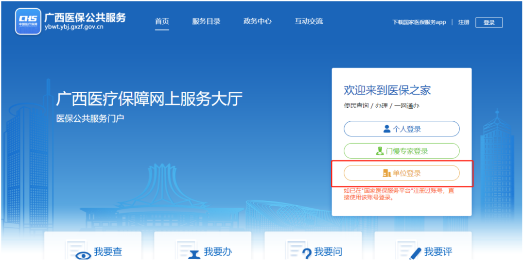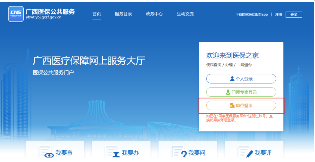单位网厅:(1)登录广西壮族自治区医保网上服务大厅,选择“单位登录“,(https://ybwt.ybj.gxzf.gov.cn);