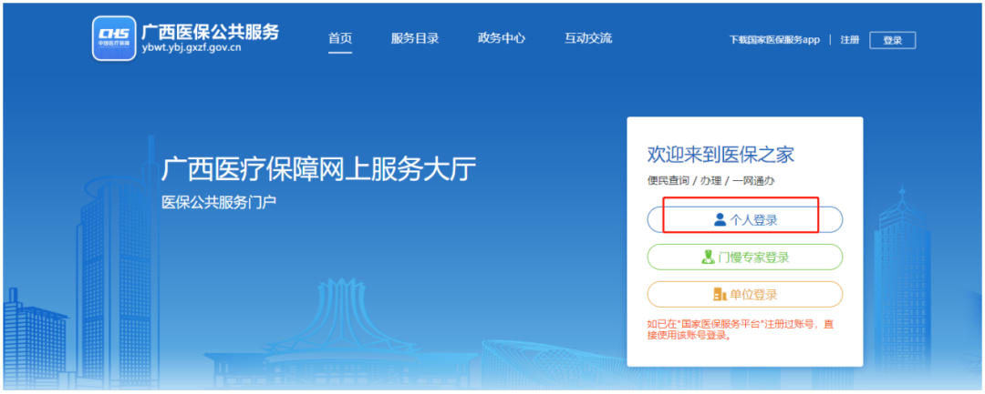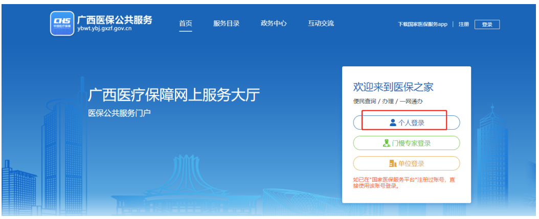 个人网厅:(1)点击“个人登录“,使用登录密码登录广西壮族自治区医保网上服务大厅(https://ybwt.ybj.gxzf.gov.cn/web/hallEnter/ );