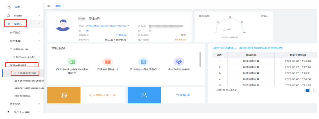 (2)选择“我要办”——“医保关系转移”下的“个人参保凭证打印 ”录入信息提交打印后交至转出地经办机构。