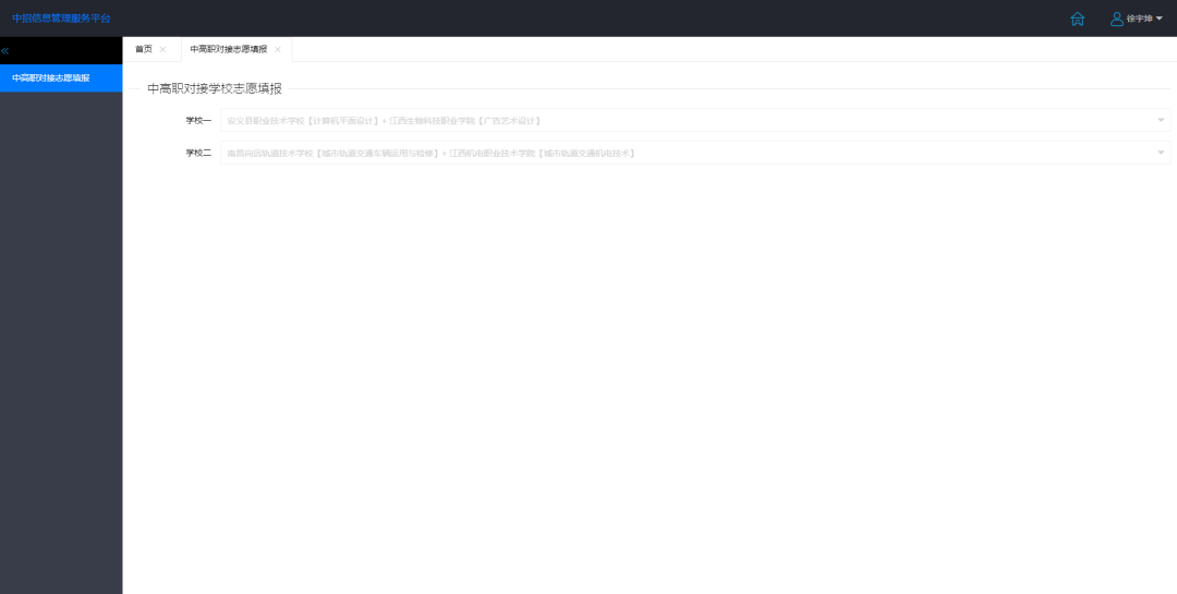 进入首页,选择左侧菜单“中高职对接志愿填报”;