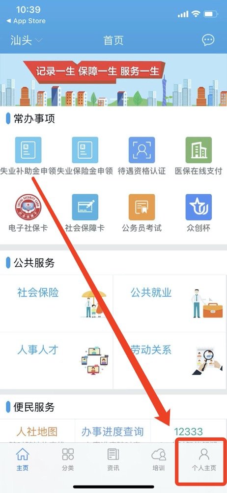 第二步:下载“广东人社app”后,进入“广东人社app”系统页面后,点击菜单栏中的“个人主页”,按照操作提示注册并登陆。