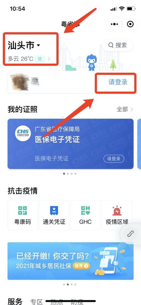 第二步:进入“粤省事”小程序系统页面后,选择左上角所在地“汕头市”,然后登陆、输入信息关联你的社保卡。