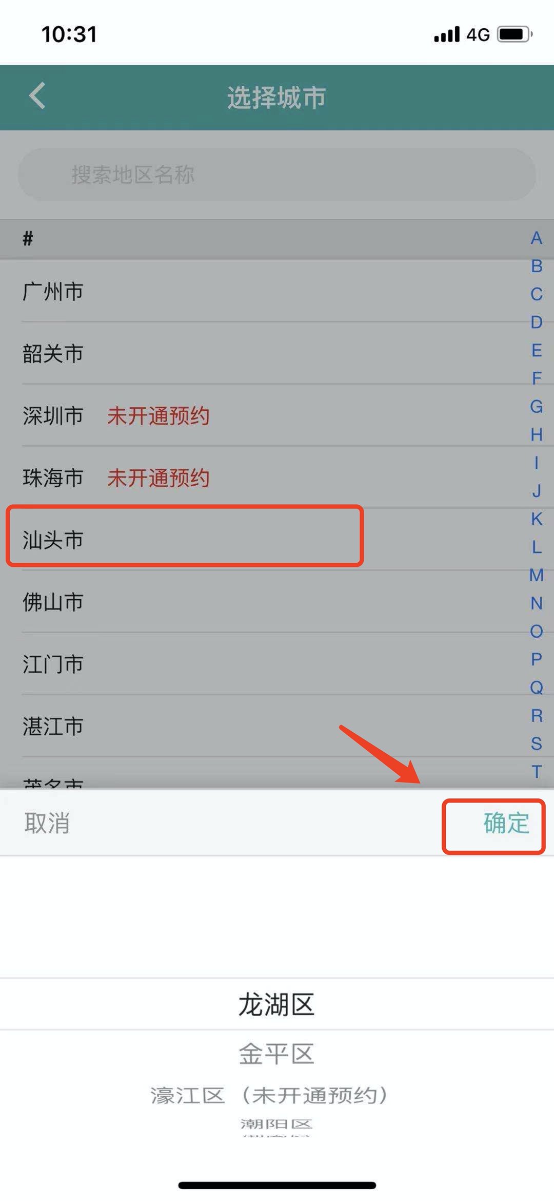 ④选择【汕头市】,点击滑动选择所在区域,查看哪些区域目前有苗开通预约。