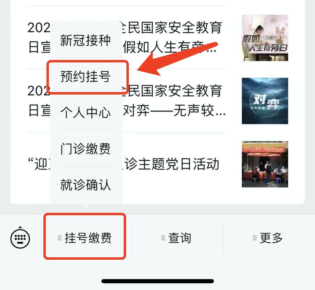 1.进入“汕头市金平区人民医院”公众号,下方菜单栏点击【挂号缴费】,选择【预约挂号】。