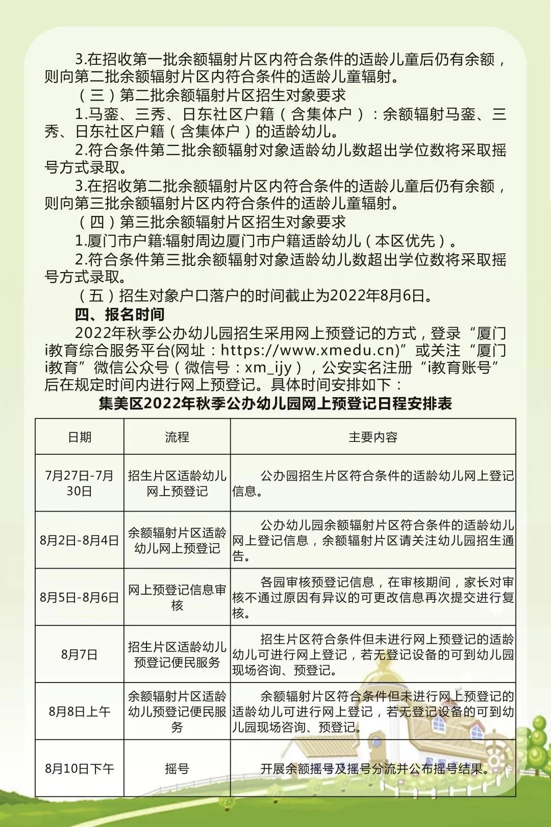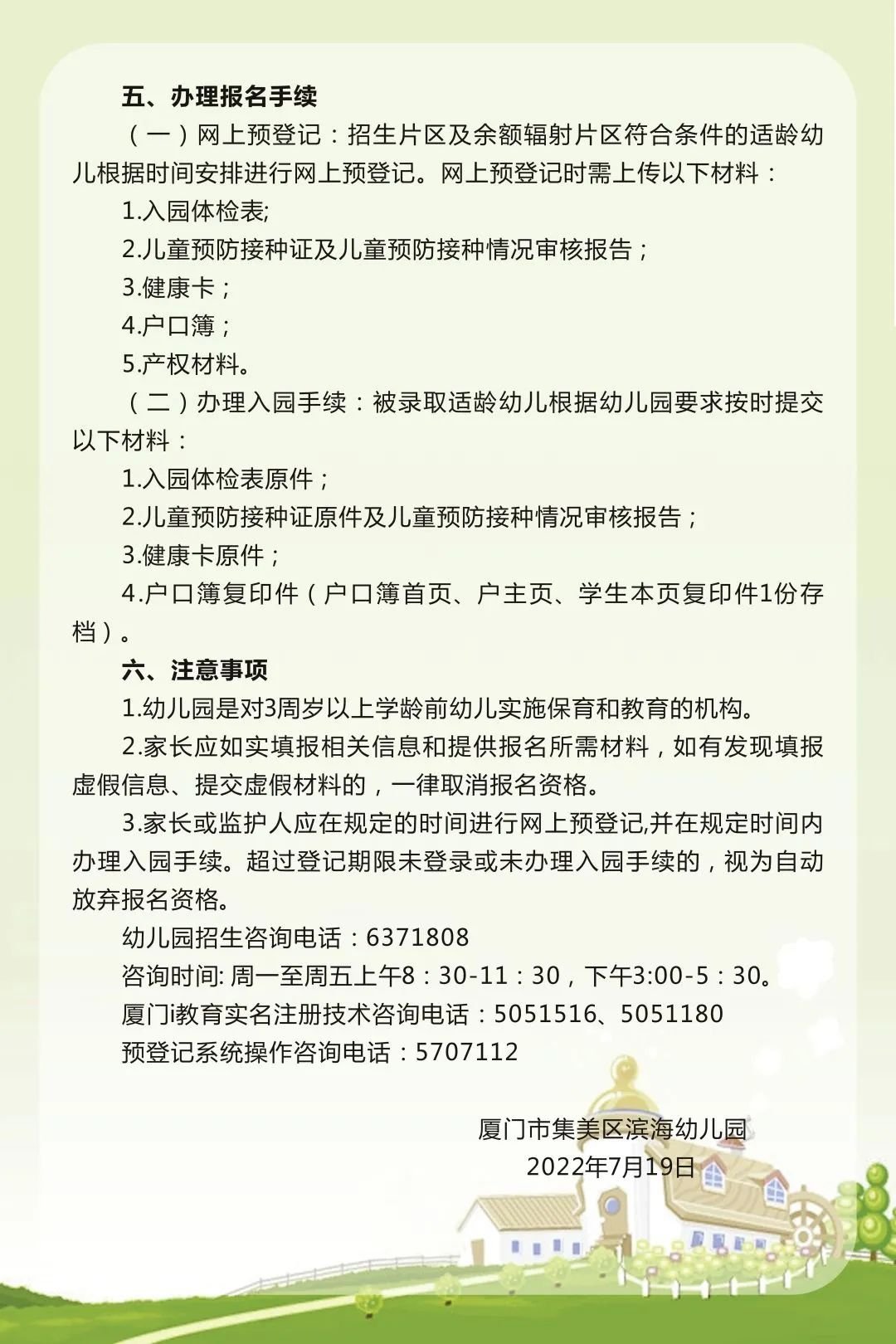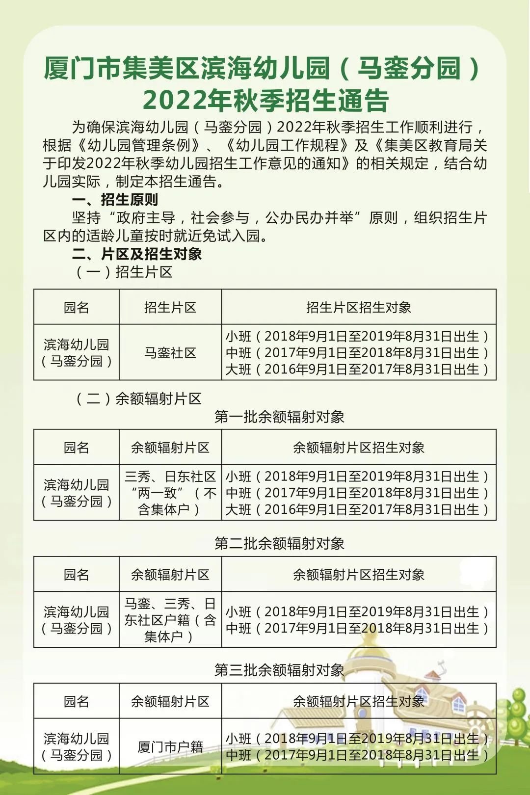 为确保滨海幼儿园(马銮分园)2022年秋季招生工作顺利进行,根据《幼儿园管理条例》、《幼儿园工作规程》及《集美区教育局关于印发2022年秋季幼儿园招生工作意见的通知》的相关规定,结合幼儿园实际,制定本招生通告。