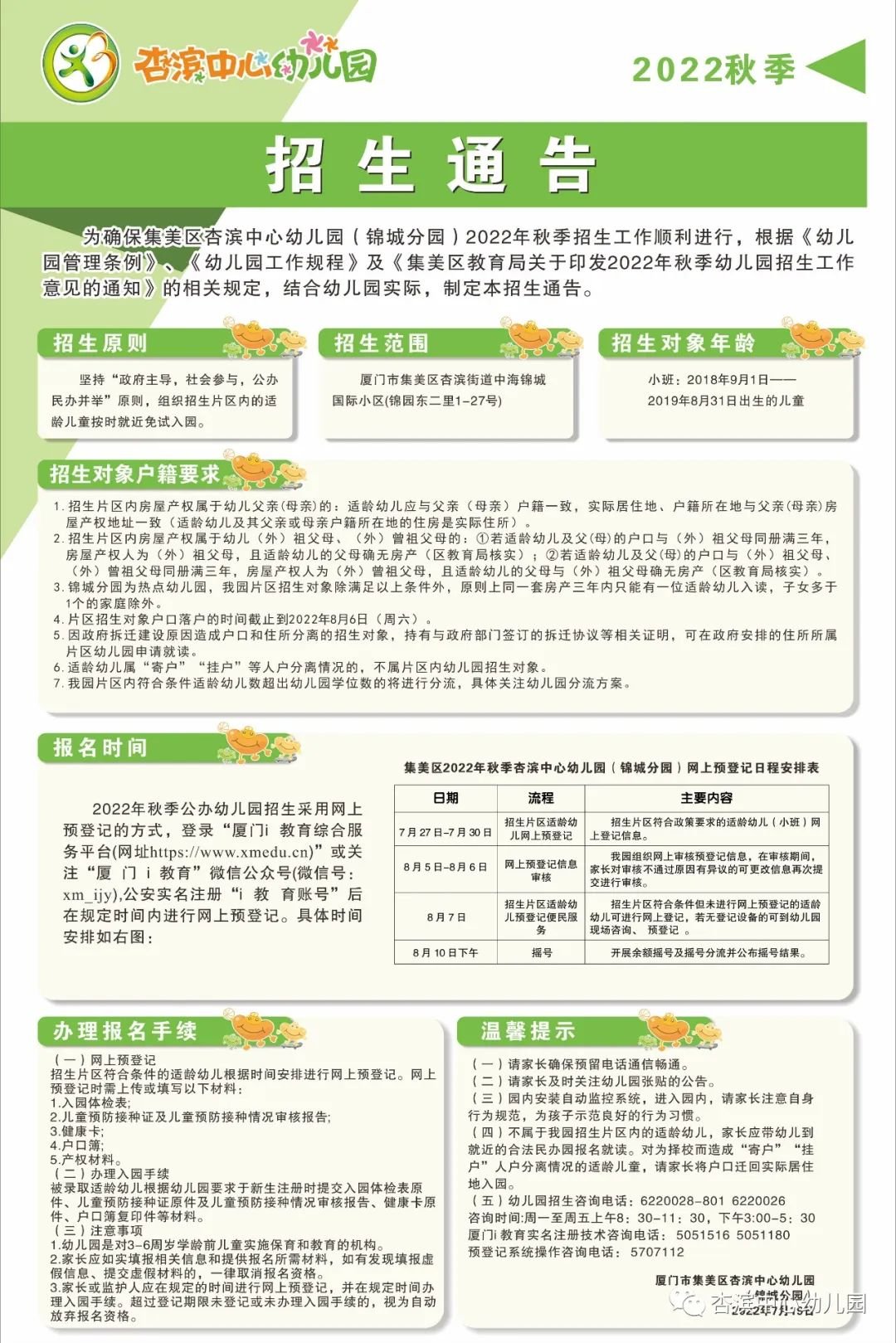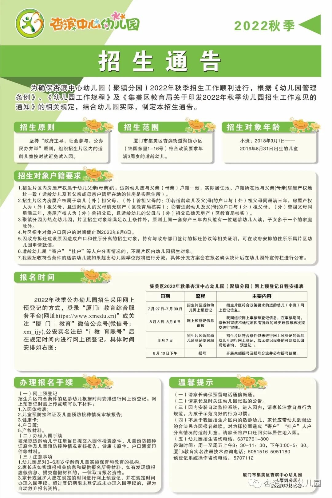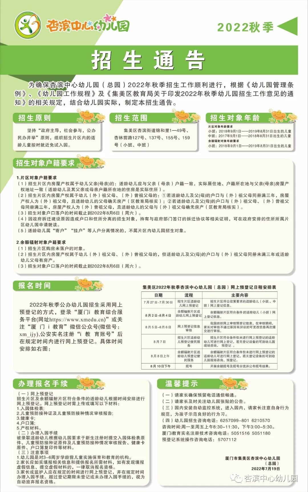 2022厦门集美区杏滨中心幼儿园招生公告(条件+时间+流程)
