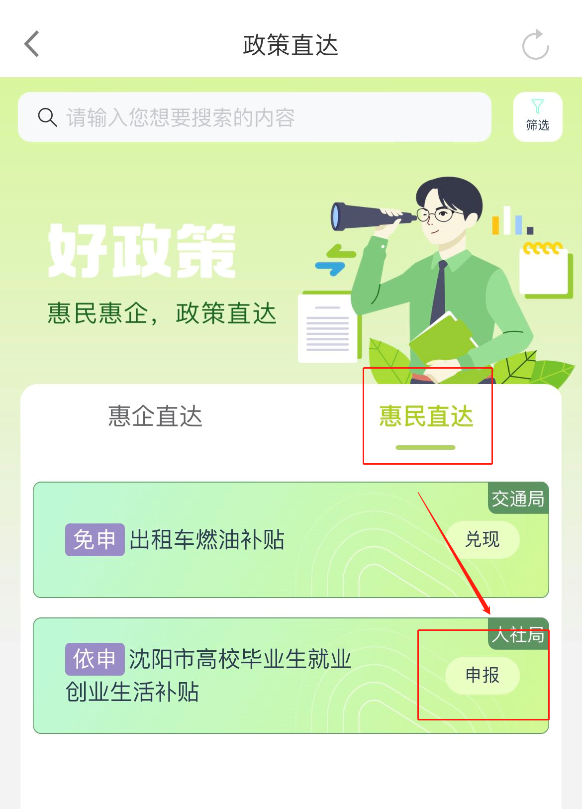 3、然后点击“惠民直达”,选择“沈阳市高校毕业生就业创业生活补贴”并点击“申报”;