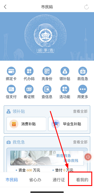 1、下载安装并打开“盛事通”APP,点击底部菜单栏“看我的”完成实名认证,并绑定补贴资金拨付银行卡;