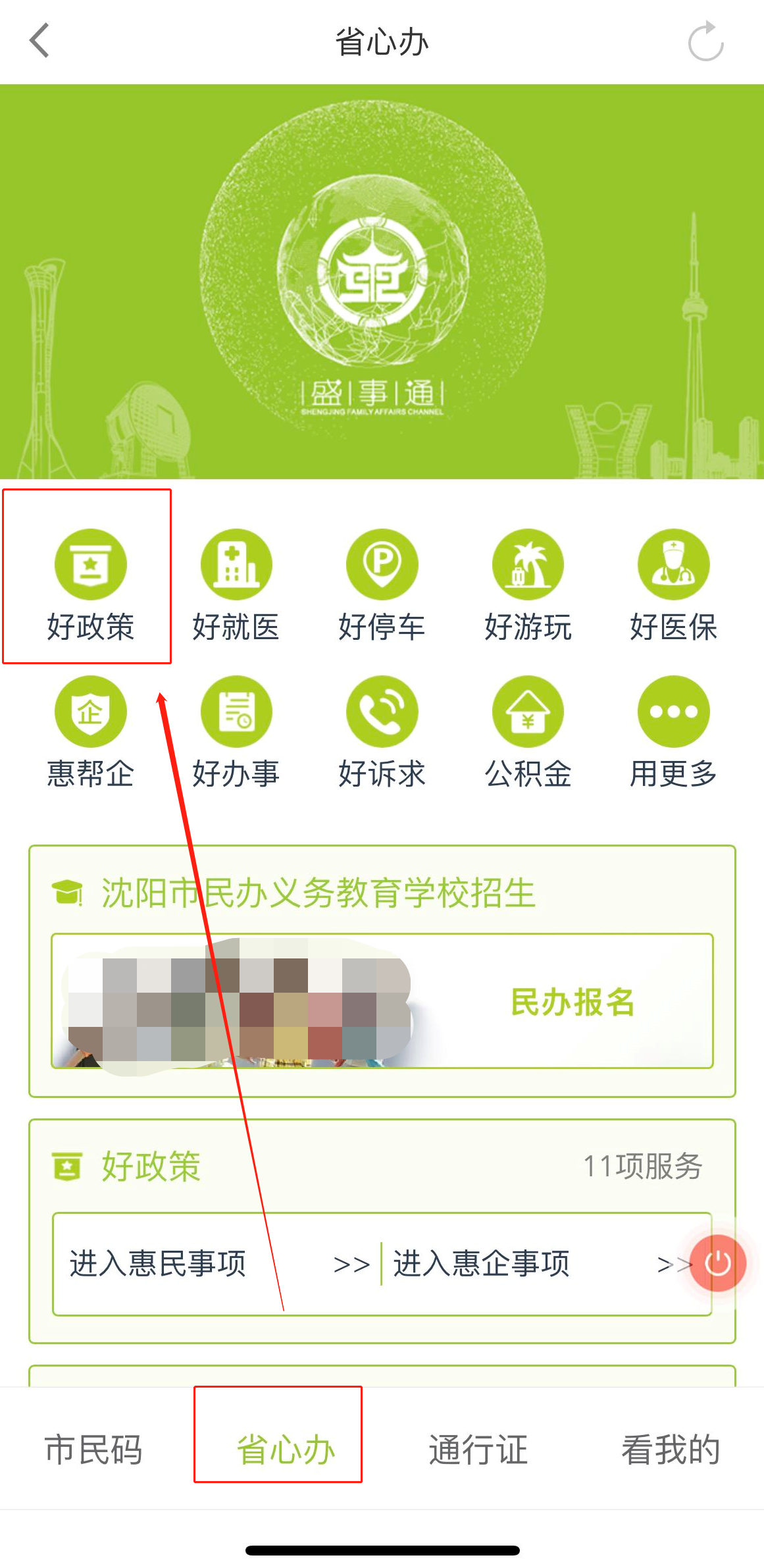 2、点击底部菜单栏“省心办”→“好政策”;