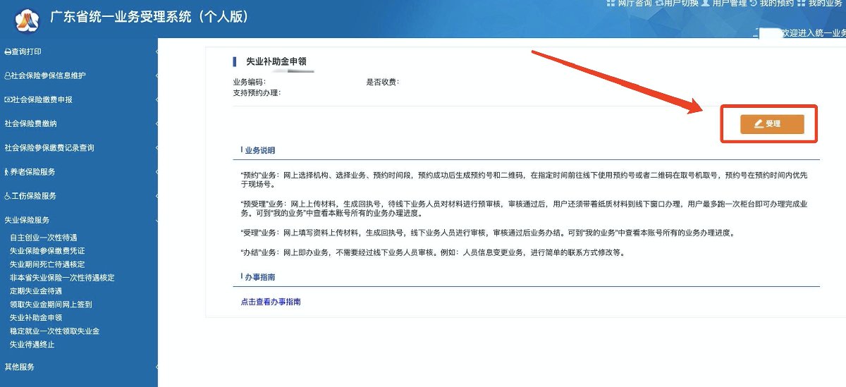 4.点击右侧白色区域的“失业补助金申领”阅读业务说明后,点击“受理”按流程操作即可完成申领。
