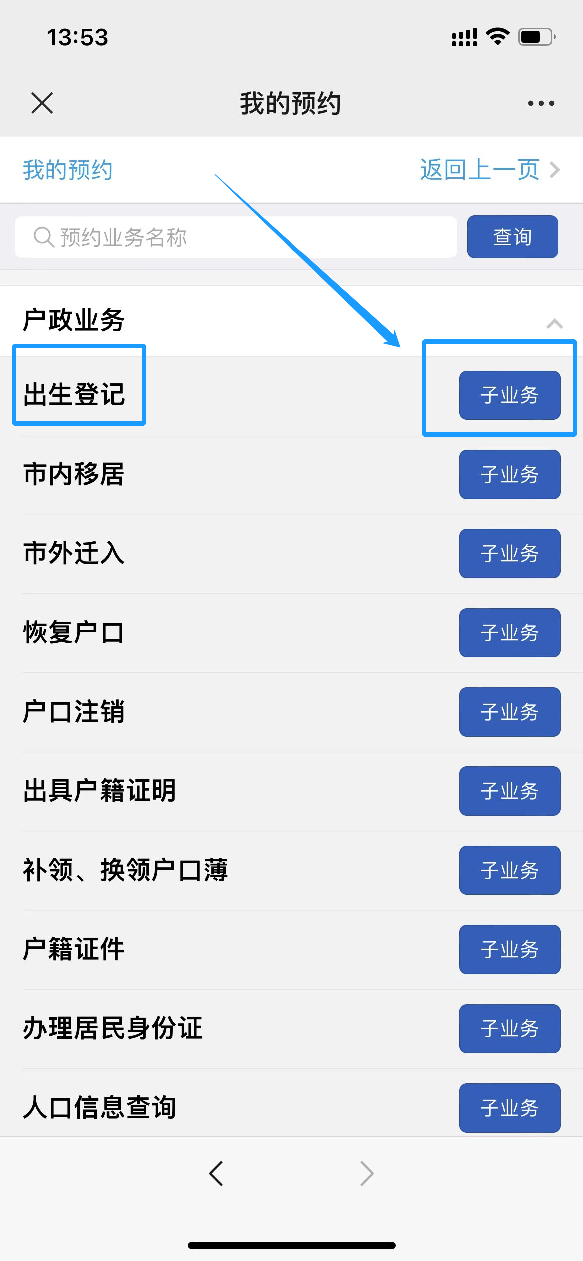 第四步:进入后第一个就是“出生登记”,点击“子业务”