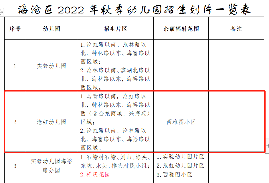 (2)沧虹路以南、沧林路以北、海富路以东、海裕路以西区域内的适龄户籍幼儿