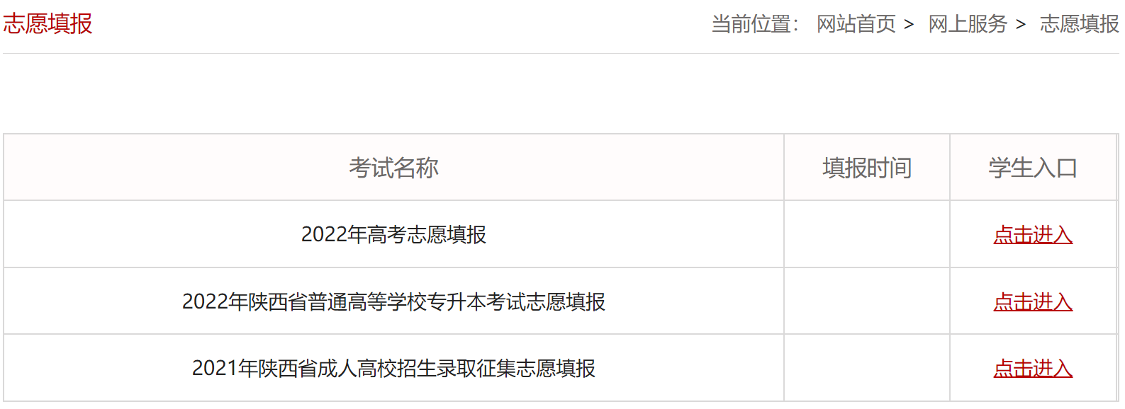 第一步:进入网站后点击页面右边“网上服务”版块中的“志愿填报”;