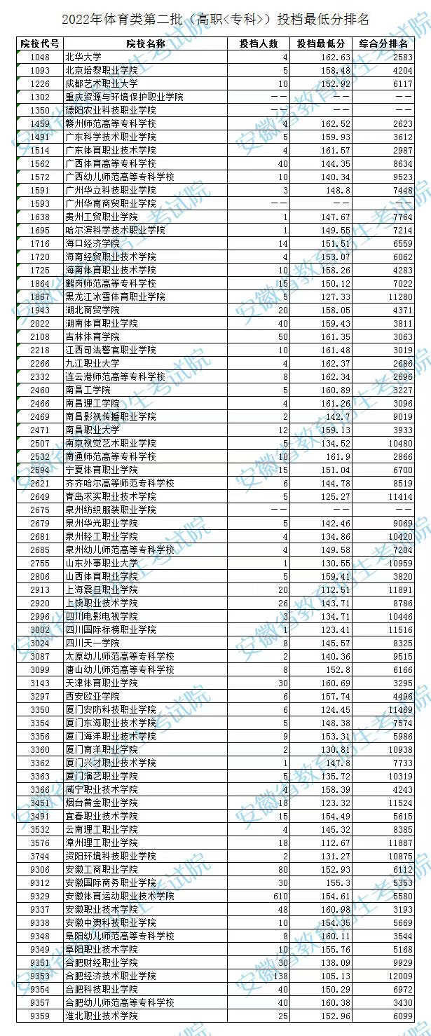 2022年体育类第二批(高职<专科>)投档最低分排名