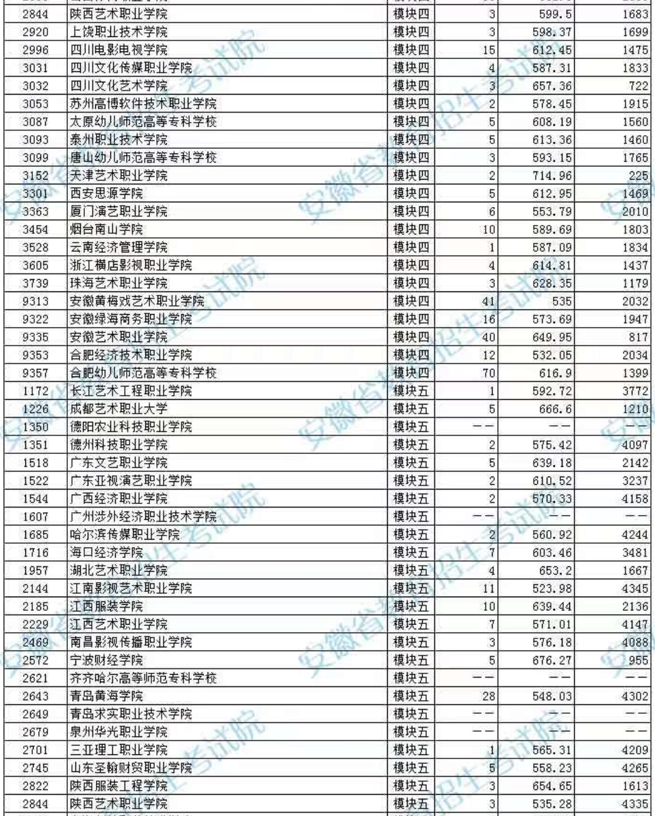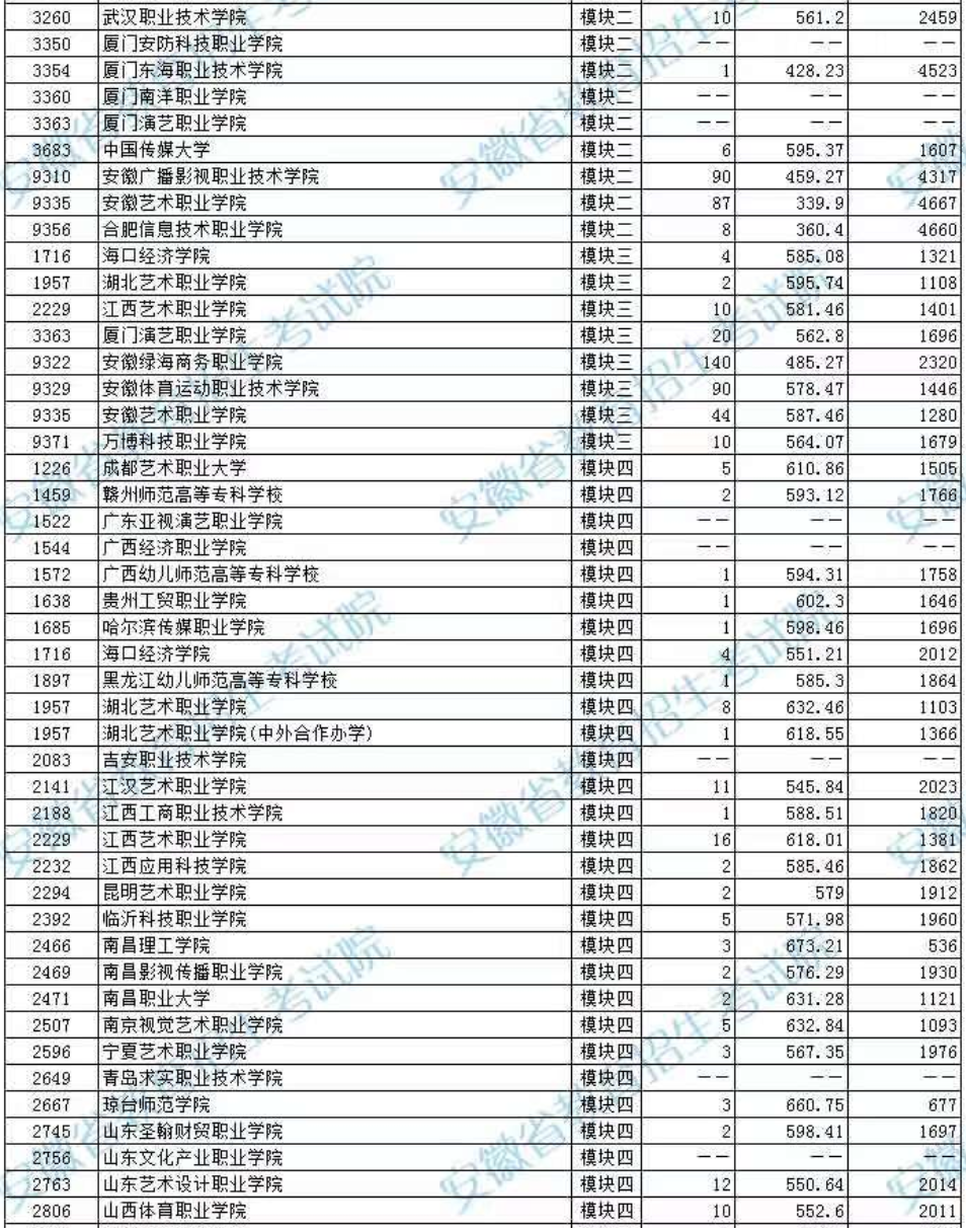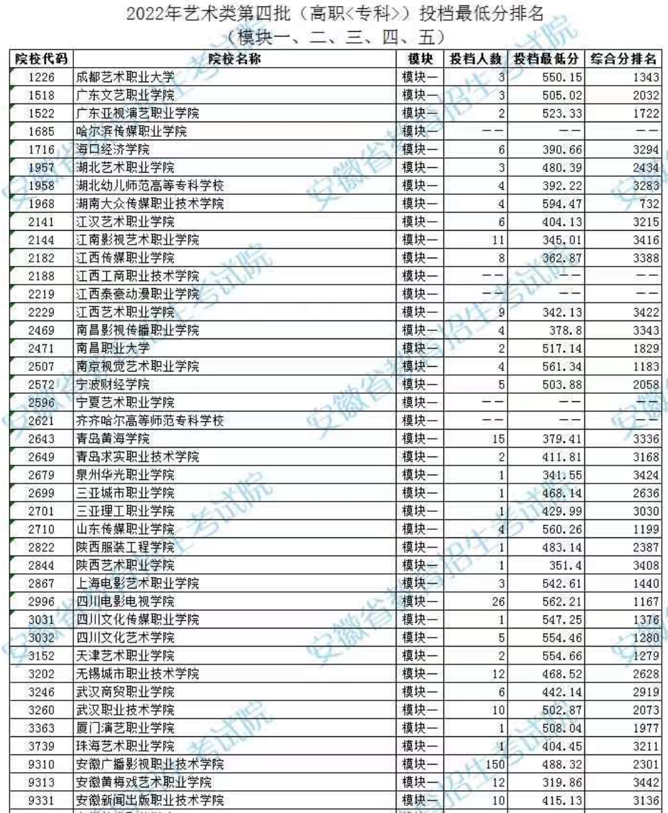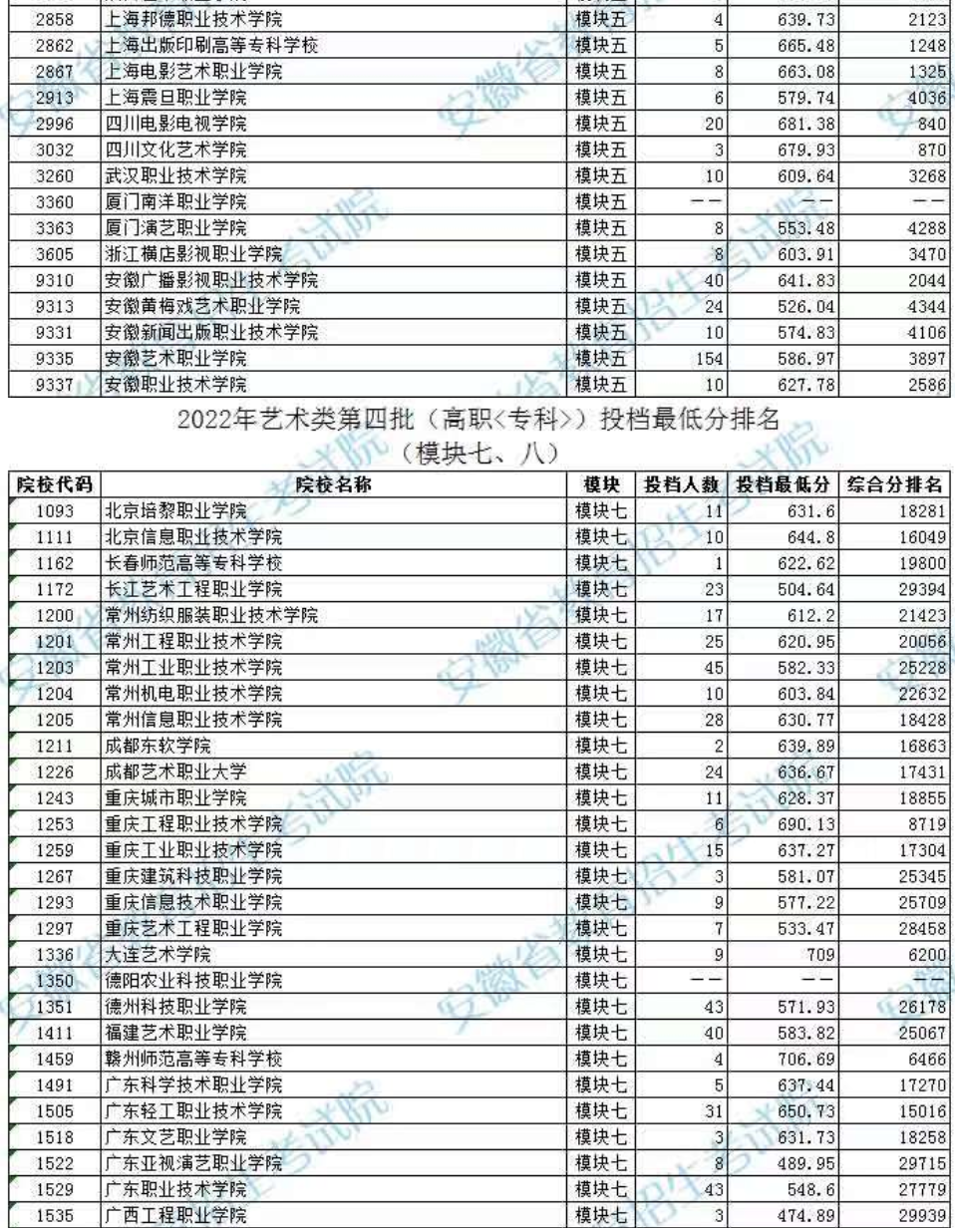 安徽2022年艺术类第四批高职专科投档最低分排名