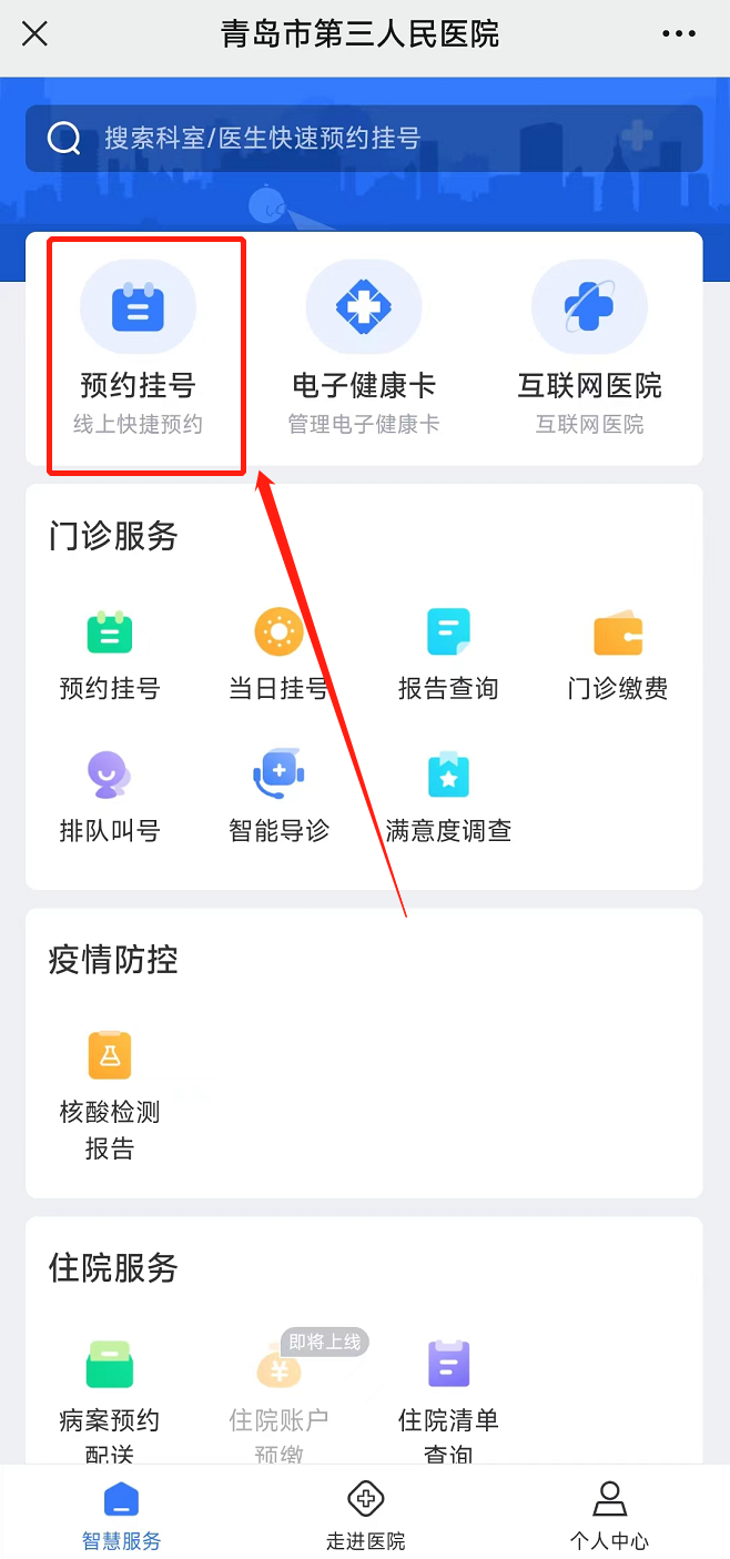 一、进入青岛市第三人民医院微信公众号,点击左下方“医疗服务”-“预约挂号”,进入医院首页。