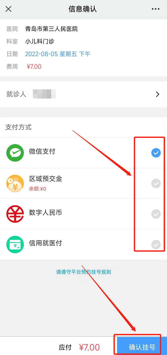 三、按需选择日期和预约医生,点击预约,支持多种支付方式;支付成功后,按规定日期到院指定地点等候就诊,无需再次取号。