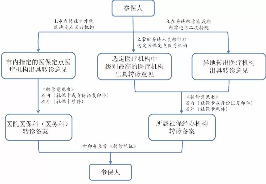 按照新政策规定,我市参保人因病情需转往市外就医地定点医疗机构住院就医的,或常驻异地人员因病情需转往非选定的定点医疗机构住院就医等情况的,在按规定办理转诊手续后,其待遇按已办理转诊手续的标准支付。