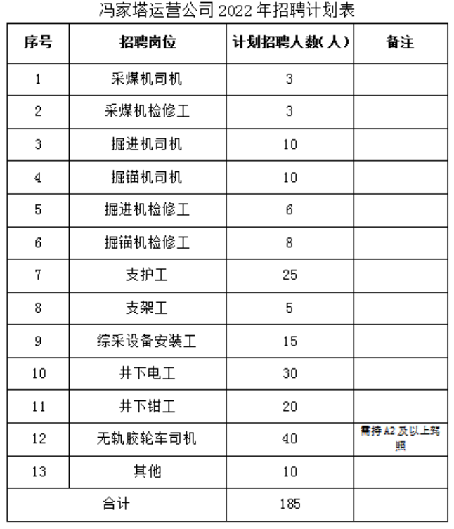 目前冯家塔运营公司设置13个职能部门和12个区队,健身房、篮球场等各类生活福利设施完善,职工教育培训成长机制健全。现因冯家塔运营公司生产经营发展需要,拟招聘正式员工185人。招聘具体工作事项安排如下: