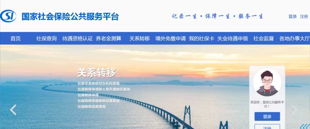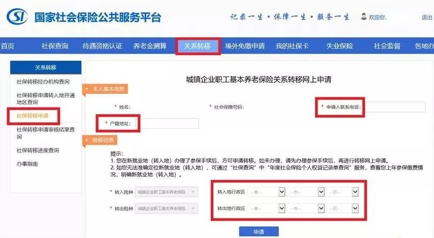 1.国家社会保险公共服务平台:点击“养老保险”-“养老保险关系转移申请”
