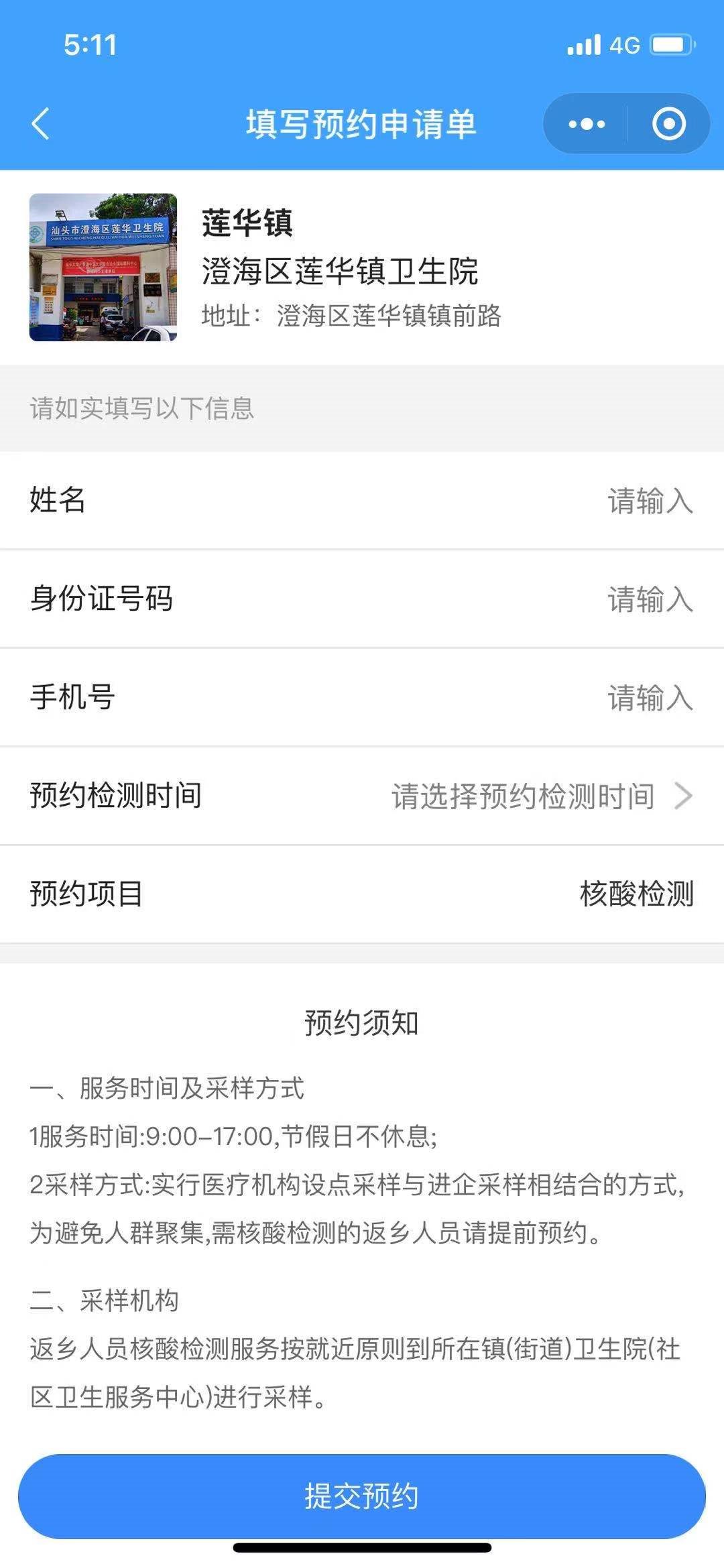 第三步:输入身份证号码、选择预约检测时间等信息,进行预约;