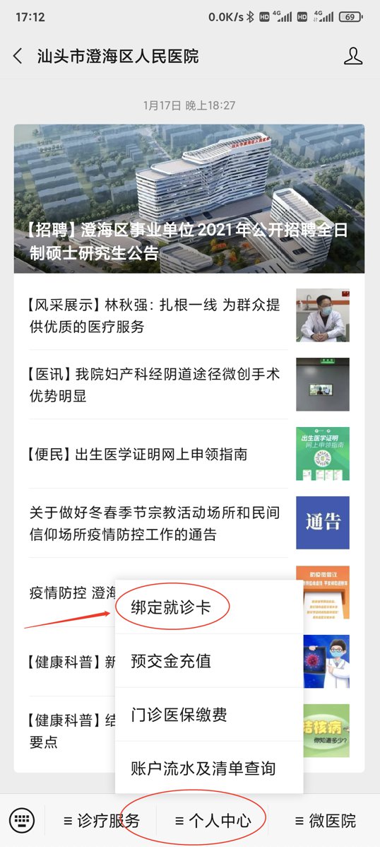 2、关注“汕头市澄海区人民医院”微信公众号,点击“个人中心”,选择绑定就诊卡;点击诊疗服务,选择报告查询-检验报告-门诊检验报告进行查询。