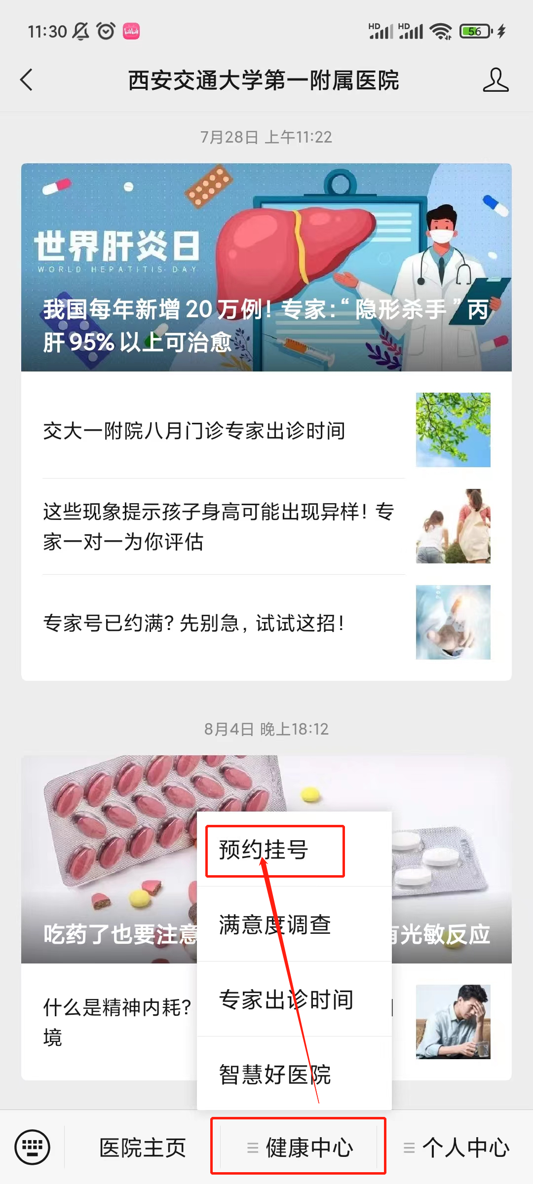 第一步:可在“西安交通大学第一附属医院”公众号进行预约,进入后点击“健康中心”的“预约挂号”;