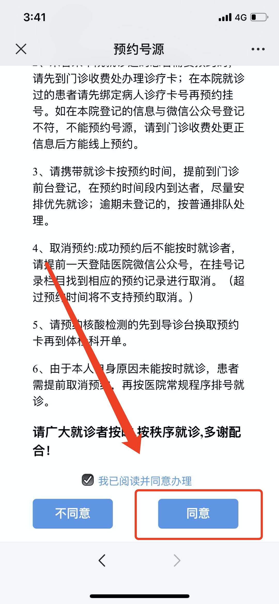 1.点击预约挂号并阅读办理须知,勾选同意进行预约