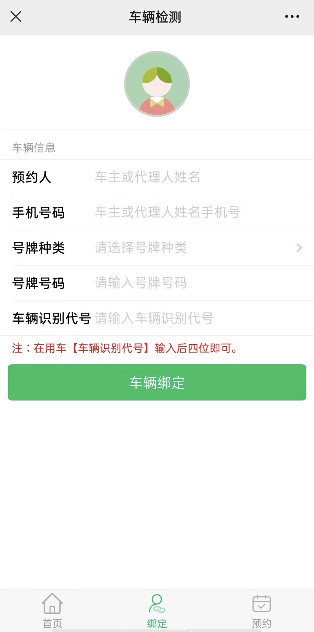 操作介绍:没有绑定车辆信息的用户在底部菜单切换到绑定界面,填写车辆信息后点击按钮【车辆绑定】,提示绑定成功该步骤完成,绑定成功后就可以预约车检业务了。