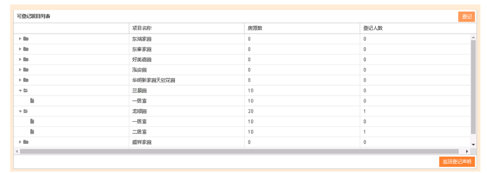5、查看可登记项目列表(展开后可详细查看该项目各居室类型的房源数及登记人数),点击右上角“登记”按钮进行网上登记。