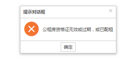 (1)未取得公租房资格或已配租的用户不可以进行网上登记,点“登记”按钮后会有下图提示。