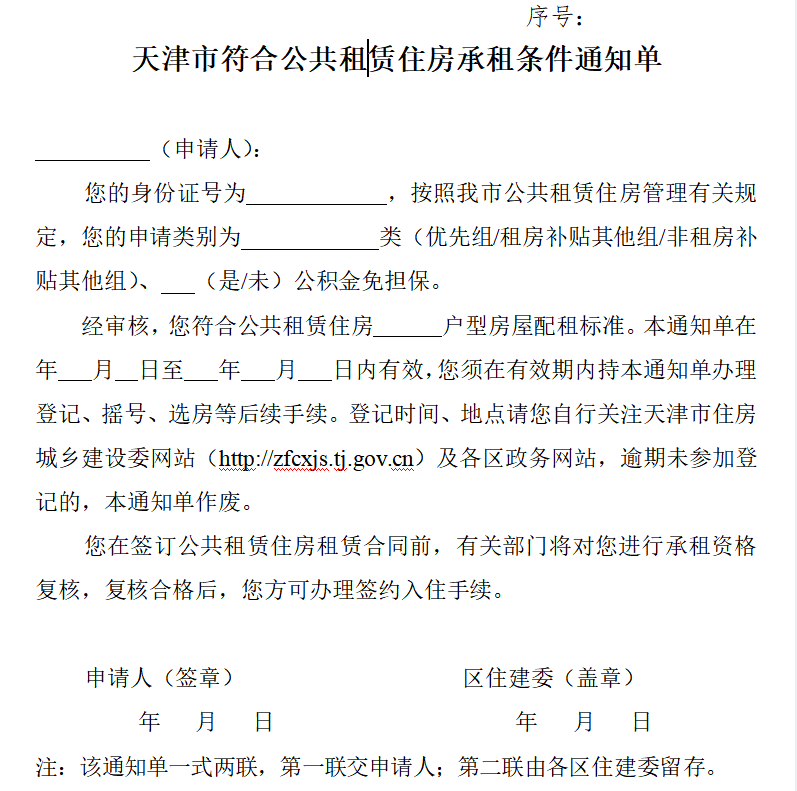《天津市符合公共租赁住房承租条件通知单》样表:
