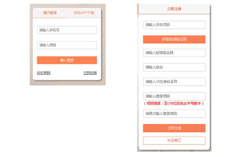 2、注册:输入手机号和验证码,输入姓名及符合规范的身份证号码进行注册,并设置登录密码。