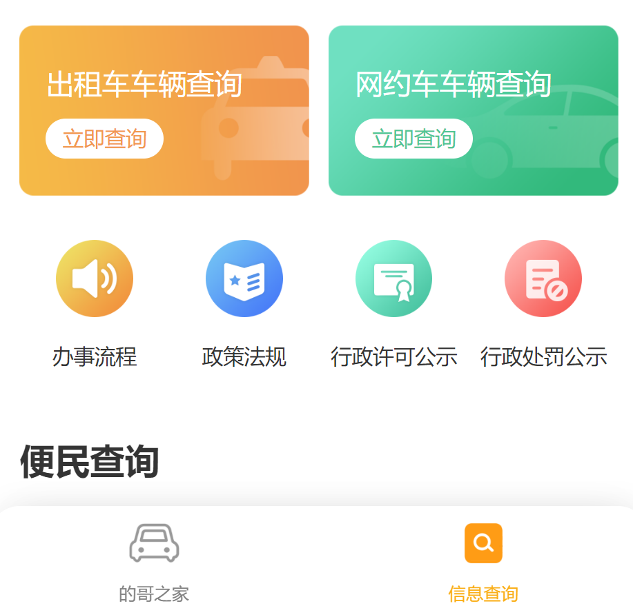 即可查看相关信息,车辆行政许可,处罚公示,办事流程,政策法规,出租车驾驶员资格查询等。